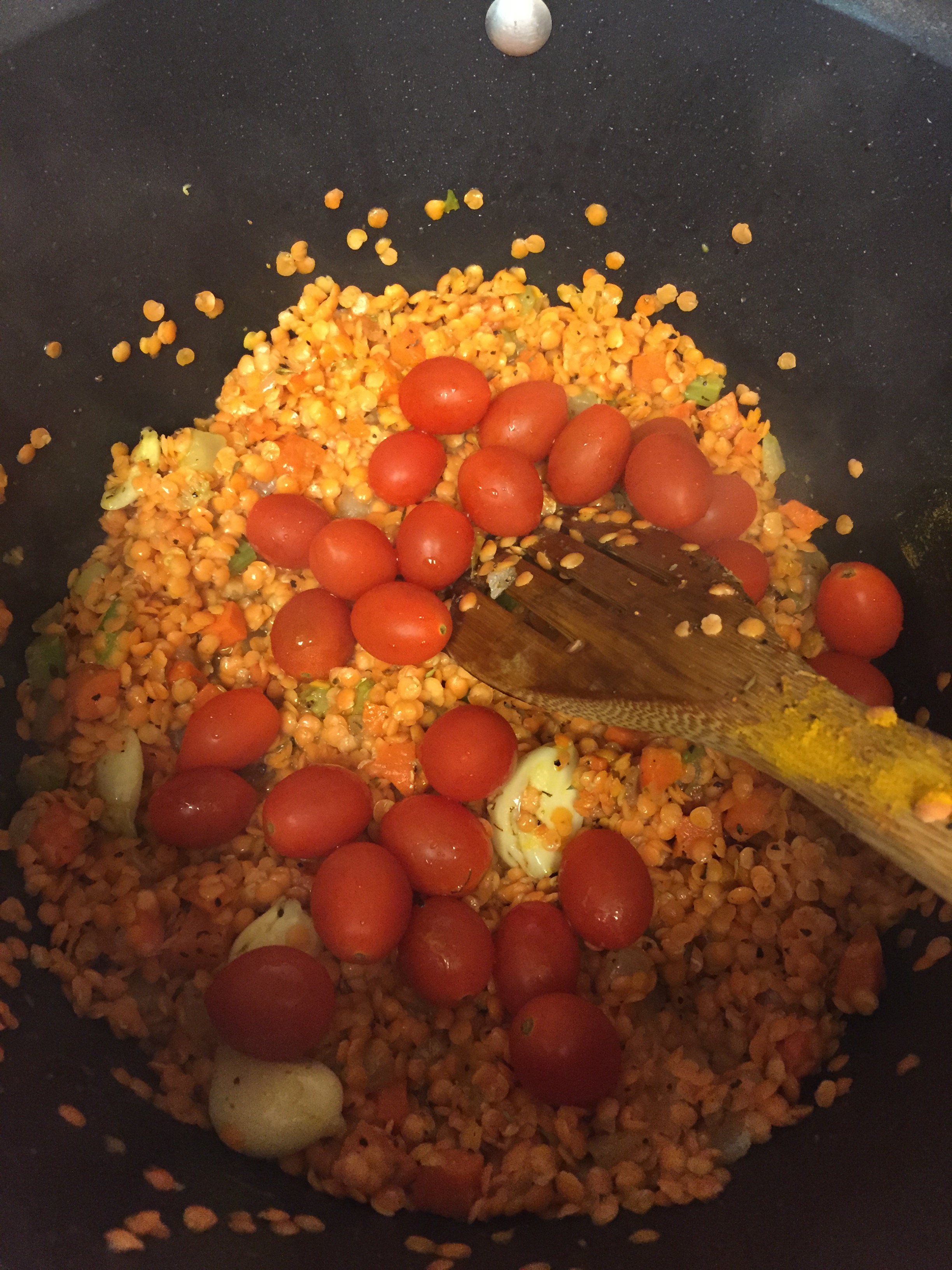 Now season with a mix of dried thyme, sea salt, paprika, and ground black pepper. I  keep a mix of these ingredients handy with the rest of my spices. Next add a hand full of whole grape tomatoes (saves you from more chopping). and 1 cup of red lentils.