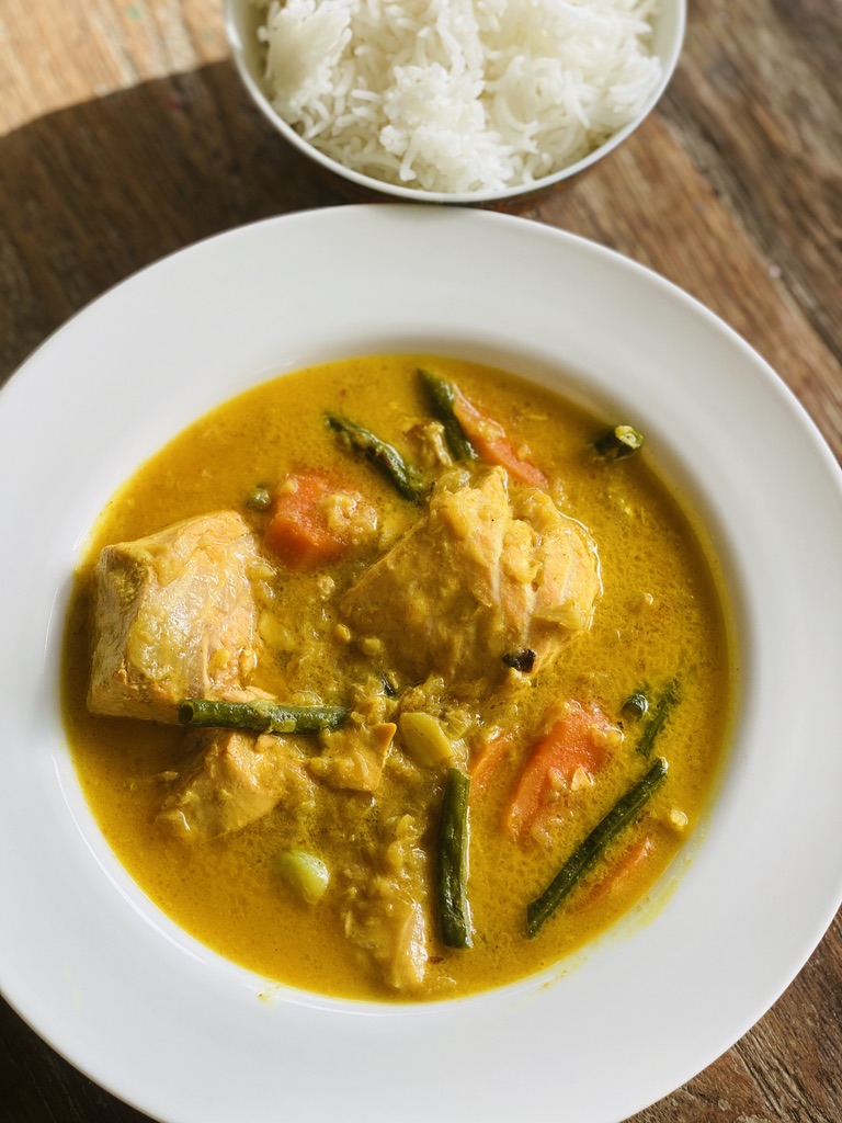 Heat a dutch oven or pot on a medium flame and add the oil. Once the oil is hot add the chopped onion and saute until the onions are soft and start to turn color. This can take a couple mins. Once the onions start to turn color add the ginger and garlic, sauteing this for about 30 seconds until the raw flavor of the ginger and garlic goes . Now add the curry powder, salt to taste, carrots, longs beans. Stir fry for a few seconds, then add the coconut milk and bring it to a simmer on a low flame for a minute. While the curry is simmering gently slide the salmon fillets in one layer, green chilli and soya sauce. Cover and cook this for 8 to 10 minutes, or until the fish is done. do not over cook as this will make the fish tough . Add the lemon juice and serve hot with steamed rice. Enjoy !