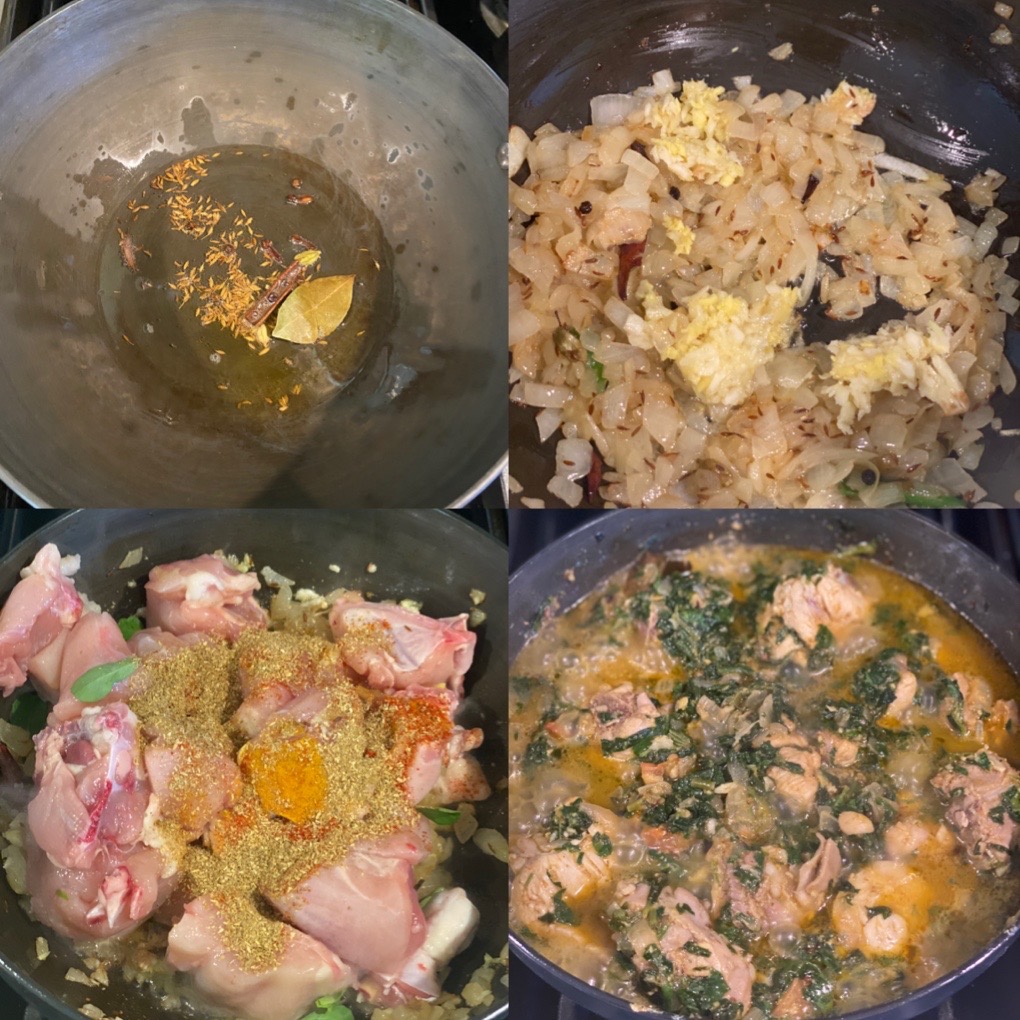 Heat a dutch oven or a wok over a medium flame and add oil. Once the oil is hot add the cardamom, cumin, bayleaf, peppercorn and cinnamon stick and after a few seconds add the chopped onion. Saute until they turn golden in color on the edges, then add the grated ginger and garlic. Again saute for a few seconds at this stage add the chicken pieces, the powdered spices, yogurt (if using) along with the salt. Turn up the flame to high and sear the meat, stirring it for a couple minutes. Now add the greens and tomato and sear this for another 30 seconds stirring it. After this add 1/4th cup of water, cover and cook on low flame for 20 to 25 minutes. Serve hot with steam rice or any bread of choice.