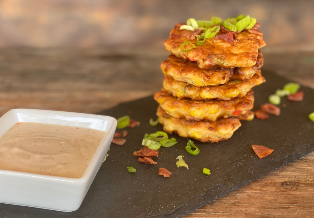 Summer is the time where corn is in abundance, and there are many fun ways to enjoy these fresh kernels. One of my favorites is making crispy corn fritters — perfect appetizers to serve up for a party, evening snack or even great to pack in a lunch box .This is an easy to make and full of flavor recipe, so lets get going!